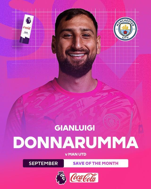 官方消息,曼城门将多纳鲁马在曼市德比的飞身单手扑救当选英超9月最佳扑救。