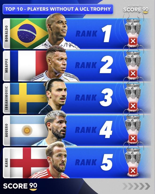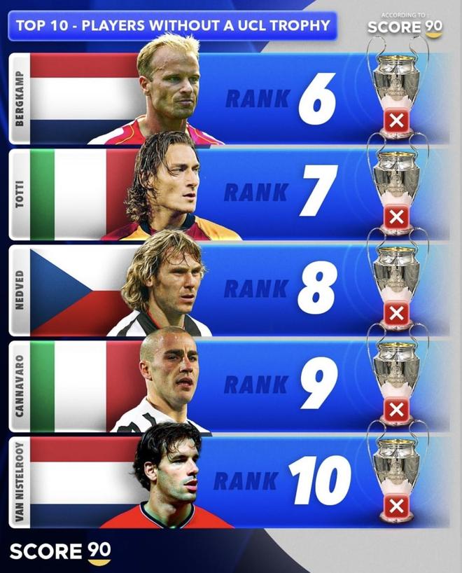 这是媒体Score 90评出的“欧冠无冠球星 TOP10”榜,罗纳尔多、伊布、托蒂、内德维德、凯恩、姆巴佩、范尼等大牌悉数在列,阵容耀眼,却都缺少一座“大耳朵杯”。同样是时代巨星,为何有人距离冠军只差一步,有人则被球队周期“错峰”?